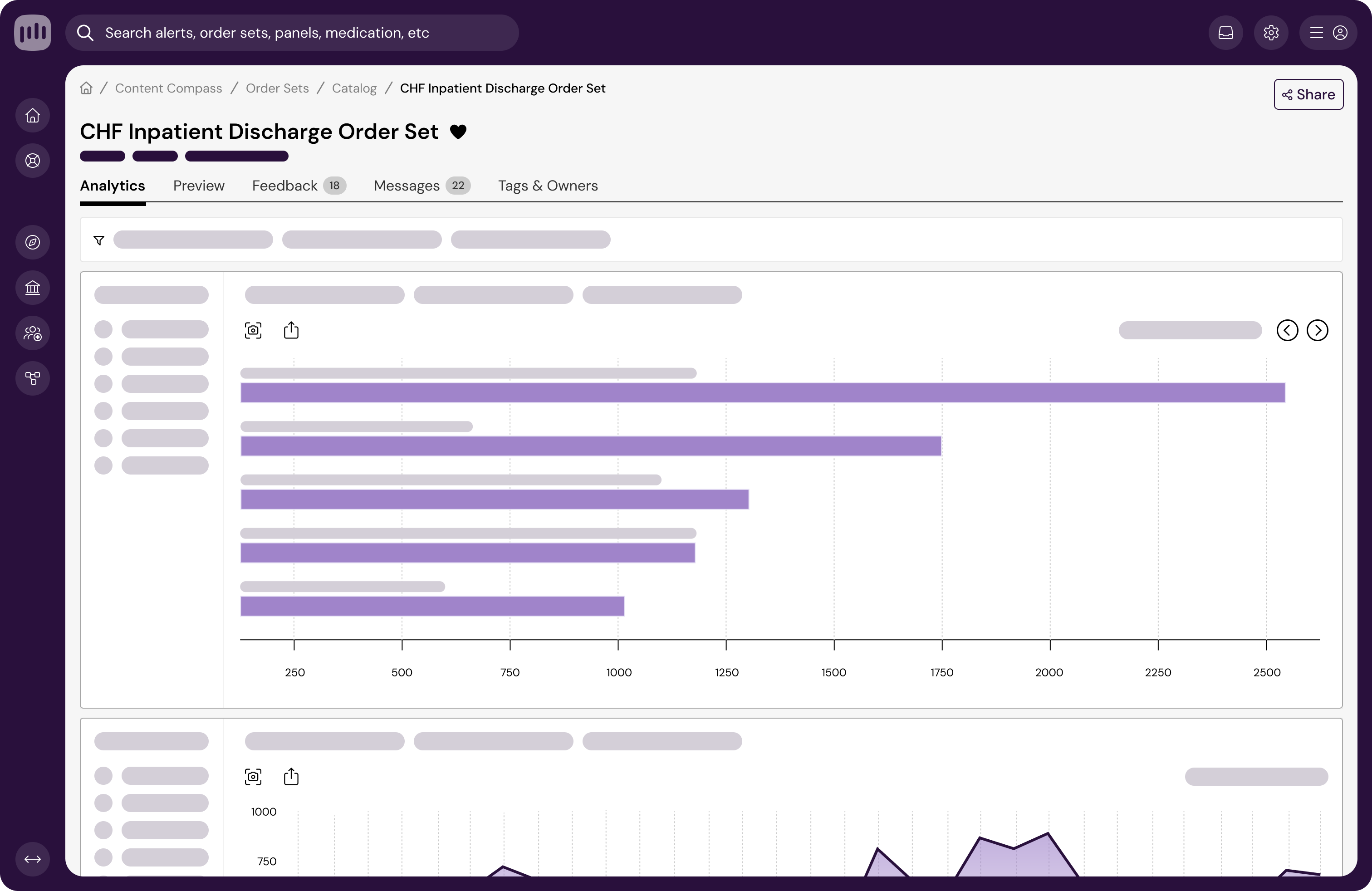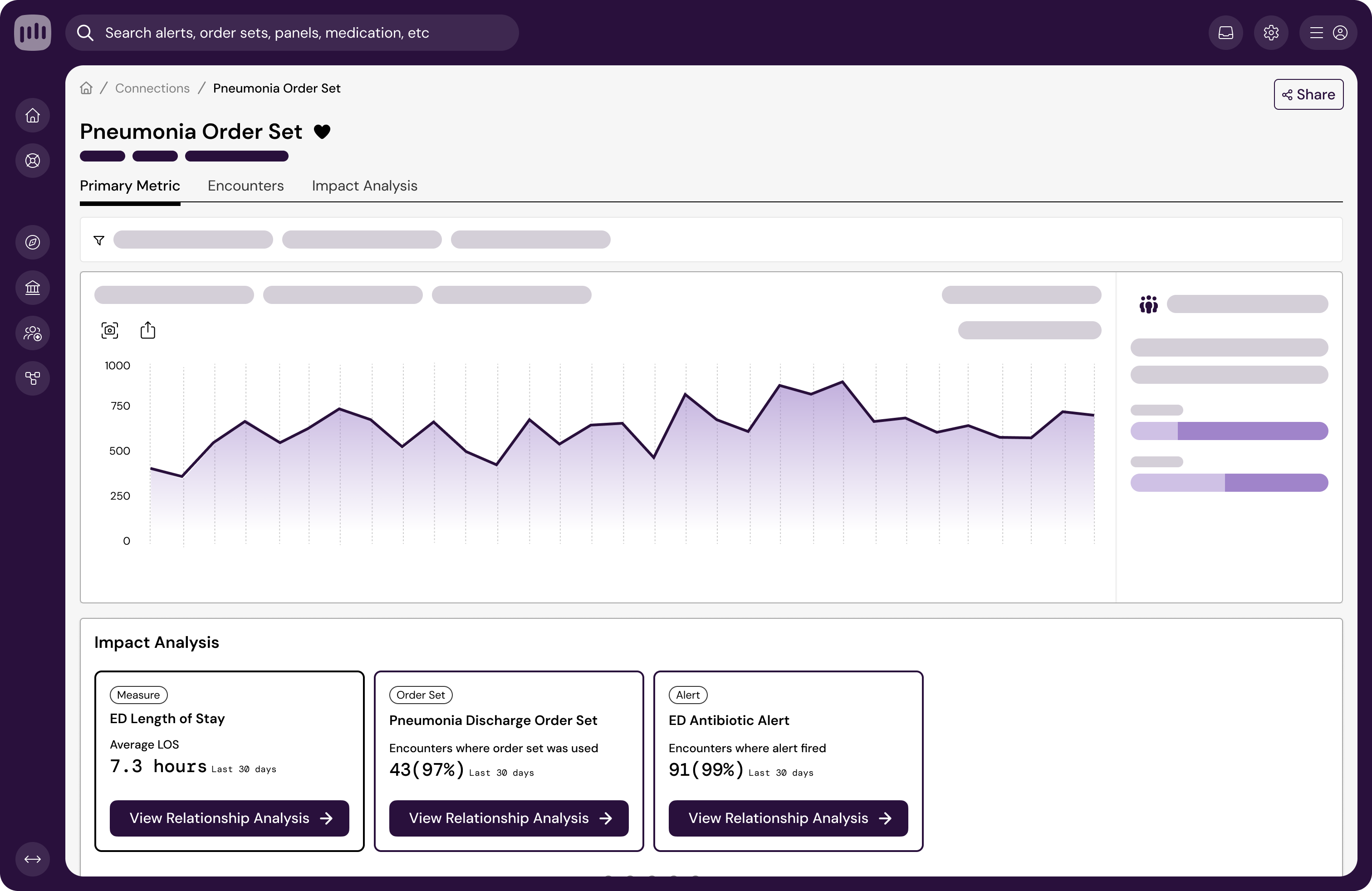 Points teams in the right direction to optimize EHR-native alerts, order sets, panels, documentation templates, and more. Reveals ordering patterns across your organization and benchmarks them against others, pinpointing where interventions will deliver maximum impact. Say goodbye to frustrating dashboards and custom reports lag-time.