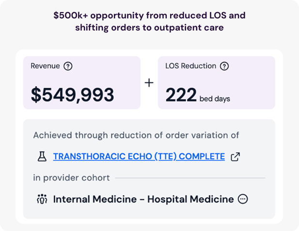 Benchmarks provider patterns, exposes unnecessary tests, and quantifies how standardization reduces bundled costs, shortens length of stay, and increases revenue.